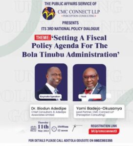 The program is billed for Thursday May 11, 2023 via an online webinar platform between 10:00am and 12:00 noon. Theme: “Setting a Fiscal Policy Agenda for the Bola Tinubu Administration”. Keynote Speaker is Dr Abiodun Adedipe, a distinguished economist with expertise in fiscal policy, banking, finance, and public sector consulting.