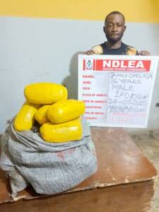 In Lagos, NDLEA operatives on Wednesday, 23rd July intercepted a suspect Chidi Agbafo, along Epe-Ajah expressway while taking consignments of 21.7kg of Colorado, some of which were packaged in moimoi cooking sachets and 3.8 liters of codeine based syrup in a commercial bus to deliver in Warri and Oghara, Delta state.