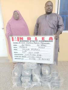 In Borno, a 30-year-old lady, Binta Usman, was on Wednesday, 23rd July, arrested by NDLEA officers who recovered 30.1kg of skunk from her house at Muna Moforo area of Maiduguri.