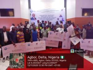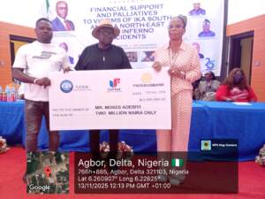 Chairman, Governing Board of The Niger Delta Development Commission (NDDC), Barrister Chiedu Ebie, on behalf of the Commission, presented financial support and palliatives to victims of the 2024/2025 inferno incidents in Ika South and Ika North-East Local Government Areas of Delta State.