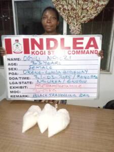 Meanwhile, NDLEA operatives in Kogi state have arrested a 33-year-old lady, Ngozi Ogili while moving 3 kilograms of methamphetamine from Lagos to Abuja.