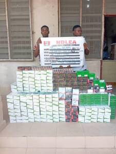 At Oja Amukoko in the Ijora area of Lagos, two suspects: Eze Chekube Emmanuel and Ike Samuel Chinyerem were on Thursday 8th May by NDLEA operatives with a total of 109,914 pills of tramadol, swinol and nitrozepam seized from them.