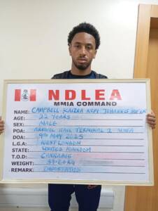In like manner, NDLEA operatives at the Murtala Mohammed International Airport (MMIA), Ikeja Lagos on Friday 9th May intercepted a 22-year-old British national, Campell Kaizra Kofi Johannes Slifer coming from Thailand through Doha on a Qatar Airways flight with two suitcases loaded with 35 parcels of Loud, a strong strain of cannabis weighing 37.60kg.