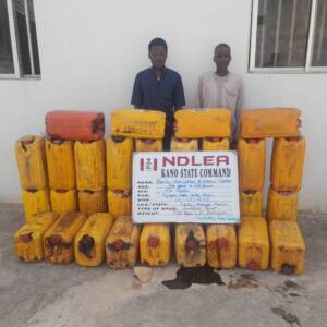 A total of 31 kegs containing 775 litres of codeine syrup were recovered from two suspects: Hafizu Isa Uman, 34, and Ismail Shehu, 48, when NDLEA operatives raided their hideout at Rijiyar Zaki area of Kano on Saturday 10th May, while 1.1kg of Loud consignment concealed in pillow coming from Thailand was on Tuesday 6th May intercepted by NDLEA officers at a courier company in Lagos.