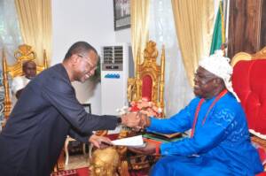 Senator Udoma Udo Udoma, Pro-Chancellor and Chairman, Governing Council of AKSU (left) presents a copy of his speech to His Eminence, Ntenyin Dr Solomon Etuk, CFR, Chancellor, during the visit.