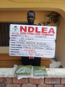 On the same day, NDLEA operatives patrolling the Kabba/Obajana highway in Kogi State intercepted a consignment of Colorado, a synthetic strain of cannabis, weighing 1.55kg.