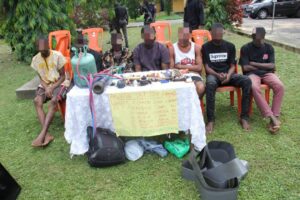 “Following intelligence report that an armed robbery syndicate terrorizing Uyo metropolis were selling out their stolen/looted items, operatives of the Command mobilized to the scene and arrested one Emmanuel Ekpenyong Bassey, 20; Saviour Etim Bassey, 24; Emem Christopher Charles, 23; Elijah Solomon Obot, 21 and Etiuwem Christian Etim, 22; all of Uyo L.G.A. Further investigation led to the recovery of one locally made pistol, one sumer- fire man SPG4000E2 generator, two LG flat screen television, Three LG speakers, one Zinox laptop, one 6KG gas cyclinder, one Gionee phone, one Huawei phone, one Tecno android phone and one Tecno button phone.